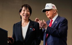 지난해 10월 28일 일본 요코스카 미 해군기지에 정박한 핵추진항모 조지 워싱턴함에서 다카이 사나에 총리가 연설을 마치자 도널드 트럼프 대통령이 박수로 화답하고 있다. AFP=연합뉴스 '공짜 점심은 없다' 총선 압승을 거둔 다카이치 사나에(高市早苗) …