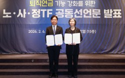 김영훈 고용노동부 장관과 퇴직연금 기능 강화를 위한 노사정 태스크포스(TF) 장지연 위원장이 6일 서울 여의도 켄싱턴호텔에서 노사정TF 공동선언문을 들고 있다. 노사정이 퇴직연금 방향 전환에 대해 공동 선언문 형태로 합의한 것은 20년 만에 처음이다. 뉴스1 …