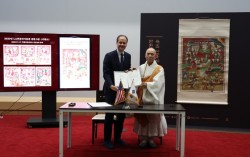 신흥사 지혜 주지스님과 맥스 홀라인 메트로폴리탄미술관 관장이 14일 서울 마포구 KGIT 센터에서 열린 속초 신흥사 시왕도 반환 언론 공개회에서 협약서를 들어 보이고 있다. 연합뉴스 한국전쟁 이후 미군에 의해 반출된 것으로 추정되는 속초 신흥사 불화 ‘시왕도’ 1…