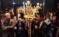 지난달 27일 경주 국립경주박물관 신라역사관에서 열린 ‘신라 금관, 권력과 위신’ 특별전 미디어데이에서 참석자들이 전시된 신라시대 황남대총 금관을 둘러보고 있다. 뉴스1 약 104년 만에 신라 금관이 모두 한자리에 모여 큰 관심을 끌고 있는 국립경주박물관 특별전이…