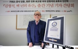 새 책 『김형석, 백 년의 유산』을 펴낸 김형석 연세대 명예교수. 그는 지난해 출간한 전작으로 기네스북 ‘세계 최고령 남성 저자’(103세 251일)로 공식 인증서(오른쪽)를 받았다. [뉴시스] “내 인생의 사 분의 일, 25년을 일제시대에 살았습니다. …