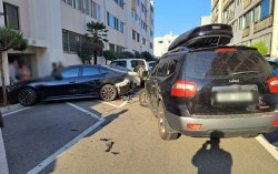 18일 오전 부산 영도구의 한 아파트 야외 주차장에서 70대 A씨가 차량 7대를 들이받는 사고를 냈다. 연합뉴스=부산 영도경찰서 설 연휴 마지막 날인 18일 부산시 영도구 한 아파트 주차장에서 70대가 운전하던 차량이 주차된 차량 7대를 들이받는 사고가 났다. …