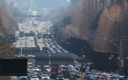 설날 당일인 17일 오후 서울 서초구 잠원IC 인근 경부고속도로 상행선(왼쪽)·하행선 방향 차량들이 서행하고 있다. 뉴스1 설 연휴 마지막 날인 18일 귀경 차량이 몰리면서 서울 방향 고속도로 곳곳에서 정체가 이어지고 있다. 오후 3~4시쯤 정체가 절정에…