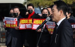 장동혁 국민의힘 장동혁 대표가 5일 청와대 사랑채 앞에서 열린 현장 의원총회에서 발언하고 있다. 연합뉴스 국민의힘이 5일 또 다시 장외로 나갔다. 이재명 대통령에게 ‘사법3법’(법왜곡죄·재판소원·대법관증원법) 재의요구권(거부권) 행사를 촉구했지만, 이 대…