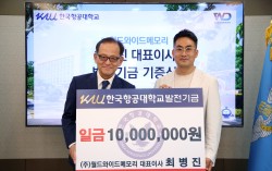 22일 열린 발전기금 기증식에서 ㈜월드와이드메모리 최병진 대표이사(사진 오른쪽)가 한국항공대 허희영 총장(왼쪽)에게 발전기금금을 전달하고 있다. 한국항공대학교가 22일 오후 2시 대학본관 이사장실에서 ㈜월드와이드메모리 최병진 대표이사의 발전기금 기증식을 …