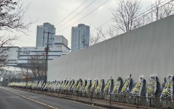 4일 서울 용산구 한강로3가 인근 용산국제업무지구 공사장 펜스에 용산구 주민들이 정부 공급대책에 항의하는 차원에서 보낸 근조화환이 줄지어 서 있다. 사진 독자 제공 정부가 1·29 공급 대책을 발표했지만 알짜 입지로 주목받는 서울 용산·노원구, 경기 과…