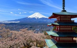 일본 야마나시현 후지요시다시에 위치한 아라쿠라야마 센겐공원. 후지산과 벚꽃, 오층탑을 동시에 조망하는 풍경이 '절경'으로 꼽히는 곳이다. 사진 후지요시다 관광진흥서비스 일본에서 후지산과 벚꽃을 동시에 조망할 수 있는 이른바 ‘인생샷’ 명소에서 올해는 벚꽃…