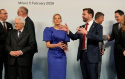 5일(현지시간) 이탈리아 밀라노에서 ㅇ려린 IOC 만찬 자리에서 JD 밴스 미국 부통령(오른쪽 3번째)과 커스티 코벤트리 IOC 위원장 등이 이야기를 나누고 있다. 맨 오른쪽이 이재용 삼성전자 회장. 로이터=연합뉴스 삼성전자 이재용 회장이 2026 밀라노…