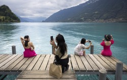 베트남 관광객들이 지난 2022년 7월 26일(현지시간) 스위스 이젤트발트 부두에서 사진을 찍고 있다. EPA=연합뉴스 2019∼2020년 방영된 K-드라마 ‘사랑의 불시착’의 촬영지로 알려진 스위스의 작은 호수 마을에 여전히 전 세계 관광객의 발길이 이어지고 있…