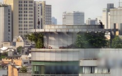 13일 서울 지하철 2호선 강남역 인근 빌딩 옥상에서 한 남성이 투신 소동을 벌여 경찰관과 구조대원들이 구조를 위해 접근하고 있다. 연합뉴스 13일 오후 3시 4분쯤부터 서울 지하철 2호선 강남역 인근 15층짜리 빌딩 옥상에서 한 남성이 투신 소동을 벌이고 있다.…
