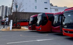 지난 6일 금요일 퇴근 무렵 강원혁신도시 한 공공기관 주차장에 공덕(서울 마포구)·마두(경기도 고양시)·수원·인천 등 수도권행 통근버스가 대기하고 있다. 김홍준 기자 “드디어 장사 천국이 열리지 않겠어요”(강원혁신도시 음식점 사장) “출퇴근 생지옥이 펼쳐…