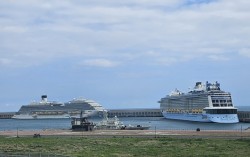 17만t급 크루즈여객선 ‘오베이션 오브 더 씨’호가 지난 10일 제주 서귀포시 강정크루즈항에 입항해 접안을 하고 있다. 왼쪽 배는 13만t급 ‘아도라 매직 시티’호. [사진 제주도] 2005년 제주 크루즈 관광이 본격화한 이후 일일 최다인 1만명 이상의 …