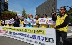 7일 서울 서초구 서울중앙지검 앞에서 홈플러스 사태 해결을 위한 공동대책위원회 주최로 열린 기자회견에서 참석자들이 홈플러스 사태의 철저한 진상 규명과 MBK 김병주 회장의 즉각 소환을 촉구하는 구호를 외치고 있다. 연합뉴스 ‘홈플러스 사태’를 수사 중인 …