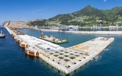 경북 울릉군에 건설되고 있는 울릉공항 모습. 지난 7일 케이슨 거치 완료를 기념하는 기념행사가 열렸다. 사진 울릉군 서울에서 울릉도까지 1시간 만에 닿을 수 있게 해줄 울릉공항 건설에 속도가 붙었다. 공항 건설을 위한 기초 구조물인 ‘케이슨’ 설치가 완료…