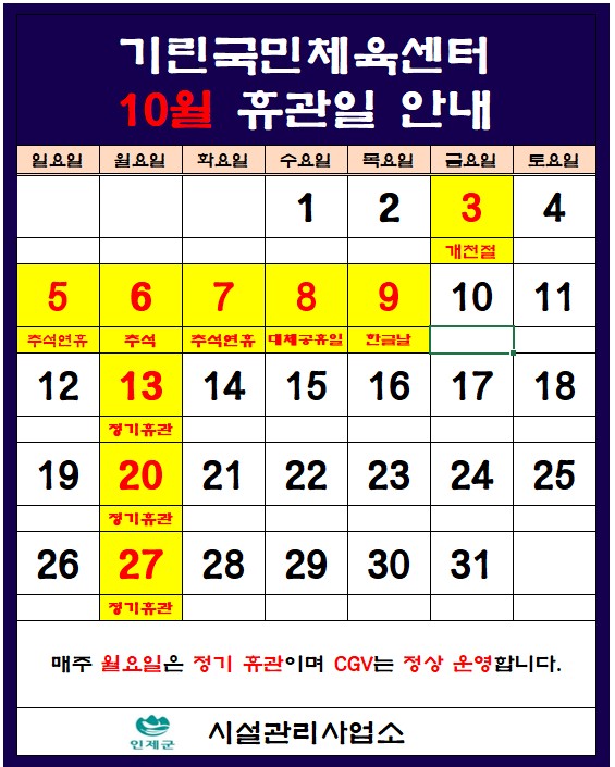 아래와 같이 기린국민체육센터 (10월)휴관일을 안내합니다.