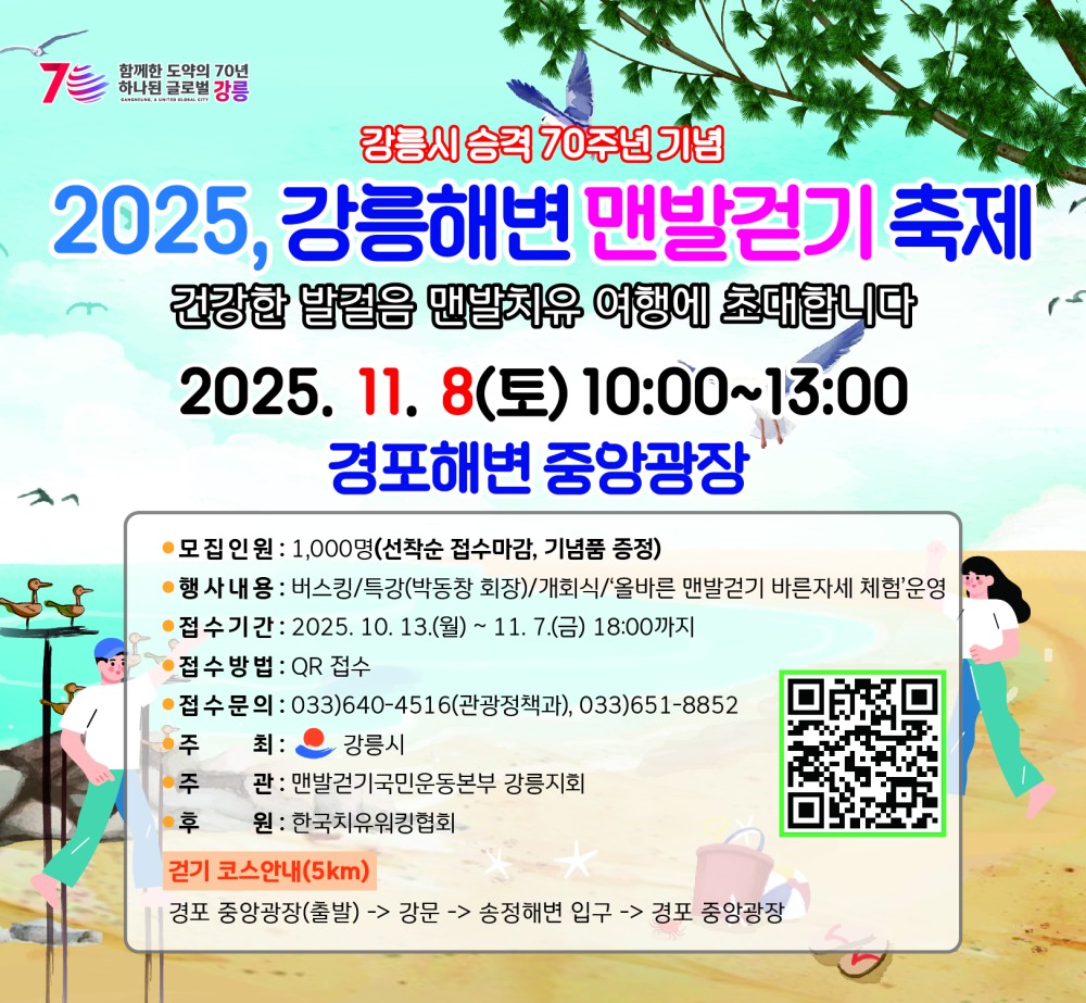 「2025 강릉해변 맨발걷기 축제」가 개최되오니 많은 관심과 참여 바랍니다.○ 행사명: 2025 강릉해변 맨발걷기 축제
