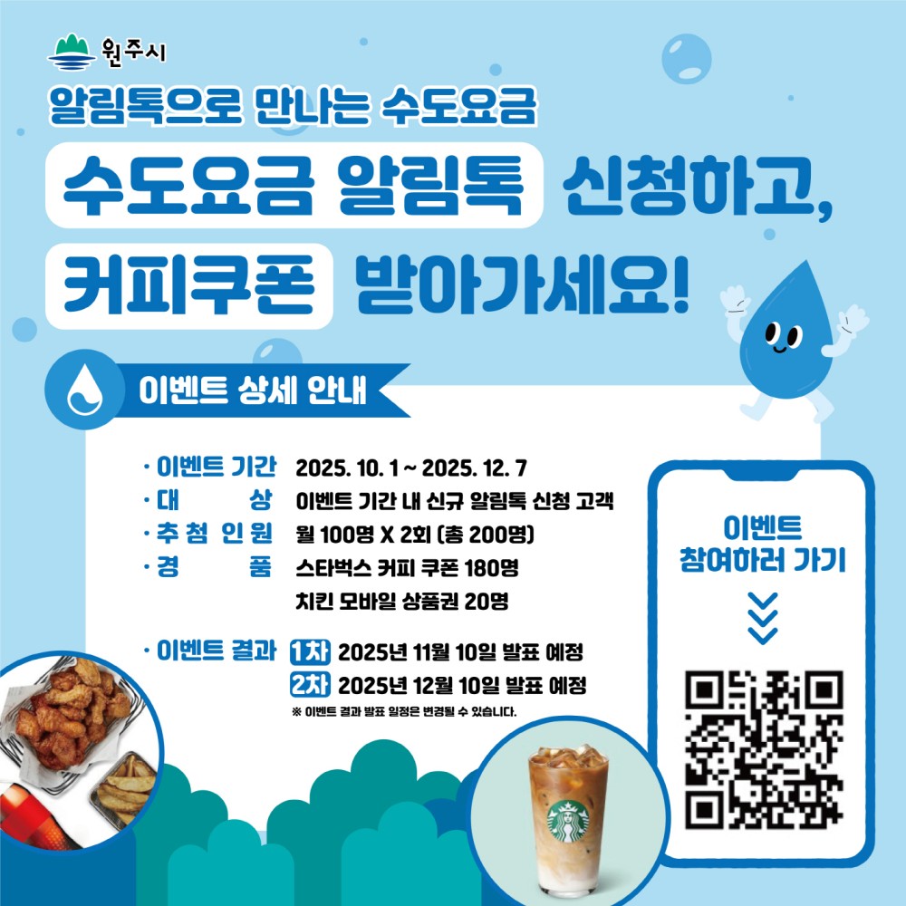 [원주시] 수도요금 알림톡 신규 가입 이벤트 알림(2025.10.1.~12.7.)
