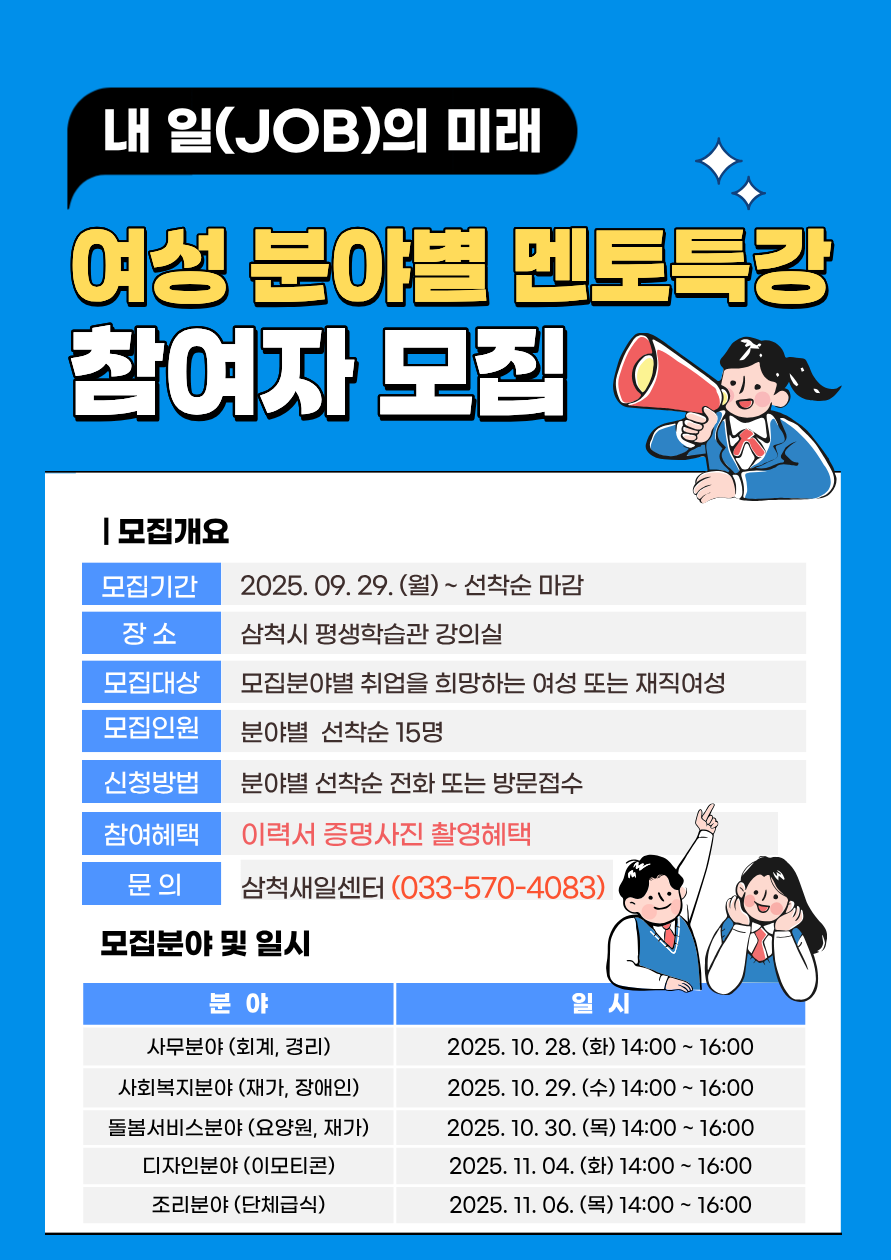 [삼척시] 「내 일(JOB)의 미래 : 여성 분야별 멘토특강」 참가자 모집