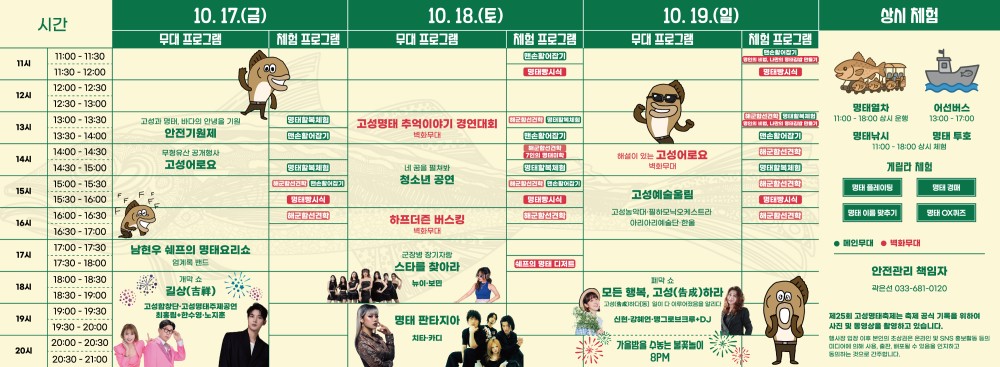 - 10. 17(금) : 안전기원제, 고성어로요, 남현우 쉐프의 명태 요리쇼, 개막쇼 길상(축하공연-고성합창단, 고성명태주제공연, 최홍림+한수영, 노지훈)