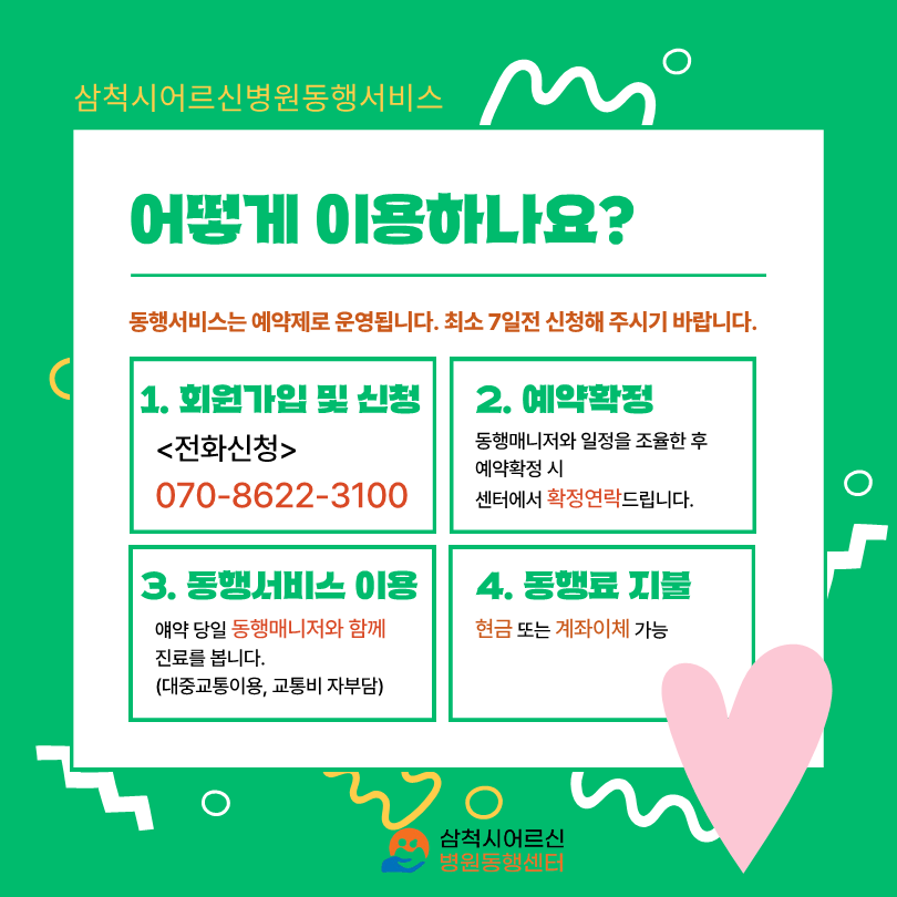 먼저 삼척시어르신병원동행센터 xxx-xxxx-xxxx으로 전화하셔서 회원가입을 하셔야 합니다.