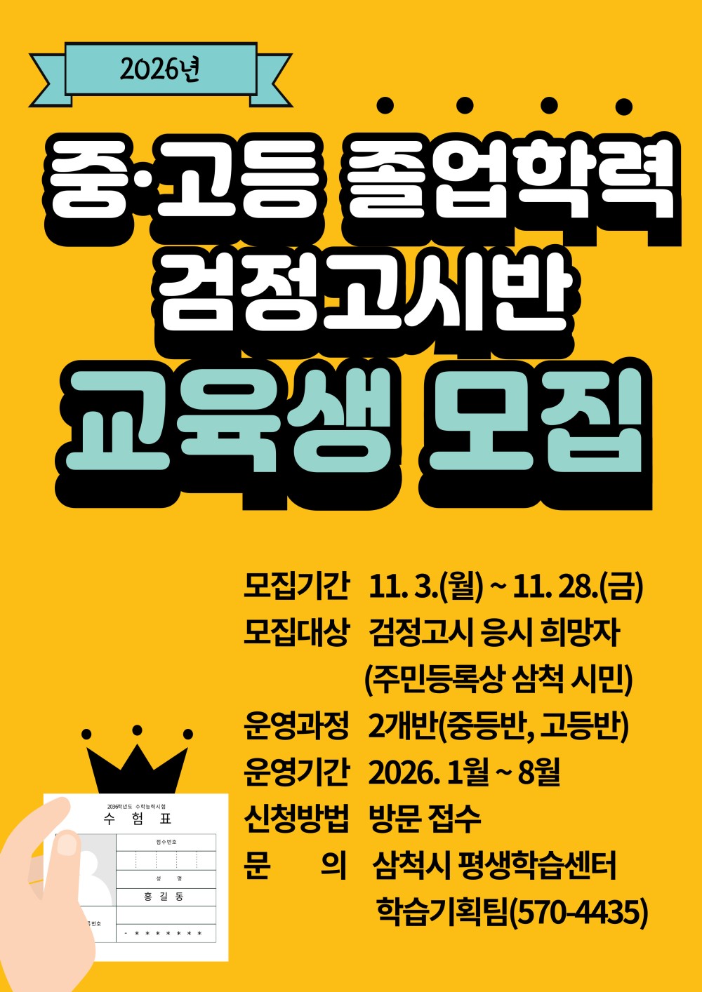 [삼척시] 2026년 중·고등 졸업학력 검정고시반 교육생 모집