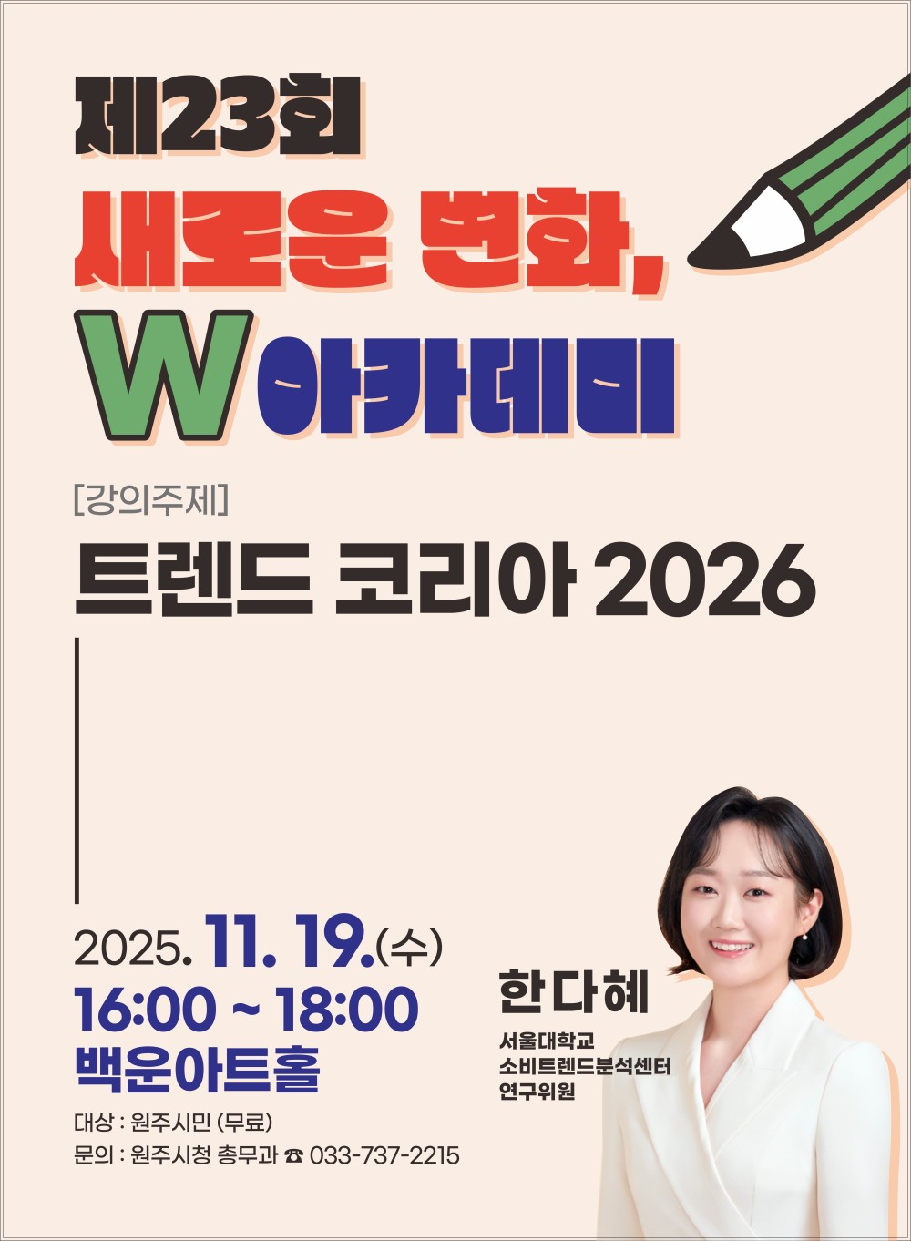 오는 11월 19일 16시 백운아트홀에서 제23회 새로운 변화, W아카데미가 개최될 예정이오니, 시민 여러분의 많은 관심과 참여 바랍니다. □ 행사명: 제23회 새로운 변화, W아카데미
