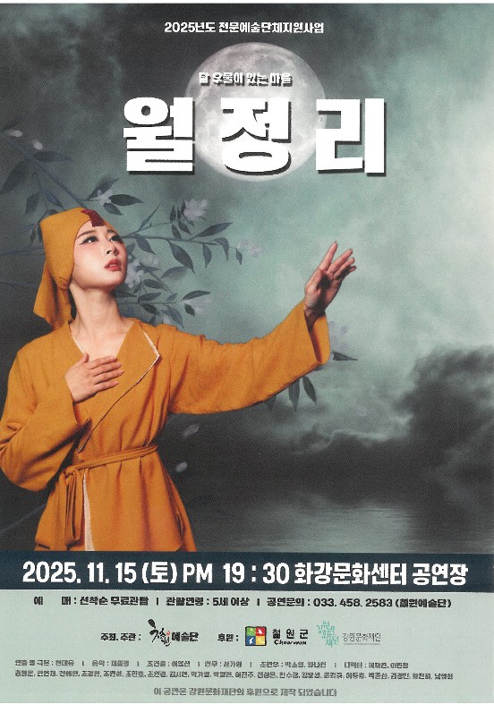 공연명: 달 우물이 있는 마을 월정리일시: 2025. 11. 15. (토) 19:30장소: 화강문화센터예매: 선착순 무료관람공연문의: 0…"/> [철원군] 철원예술단 공연 안내 - 시군별소식 | 아이러브강원
