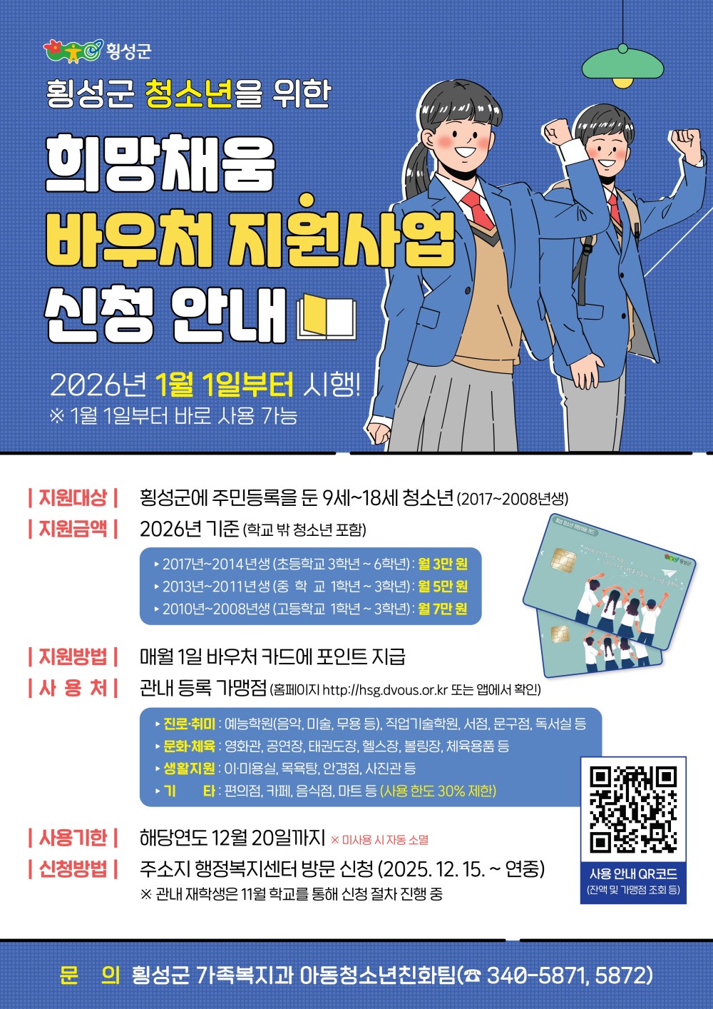 2026년부터 '횡성군 청소년 희망채움 바우처 지원사업'을 시행합니다.