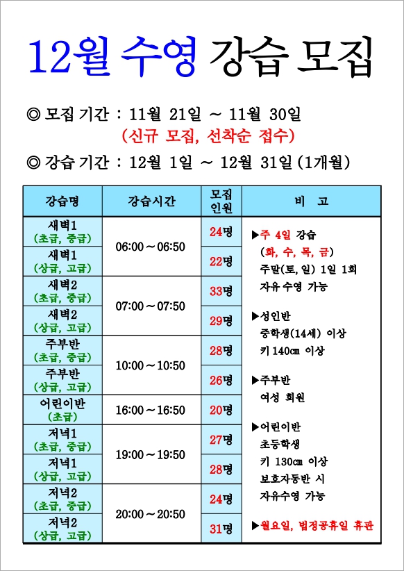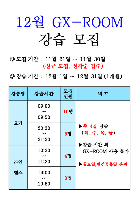 [인제군] 원통체육문화센터 12월 운영달력 및 (수영,라인댄스,요가 )강습 모집 안내