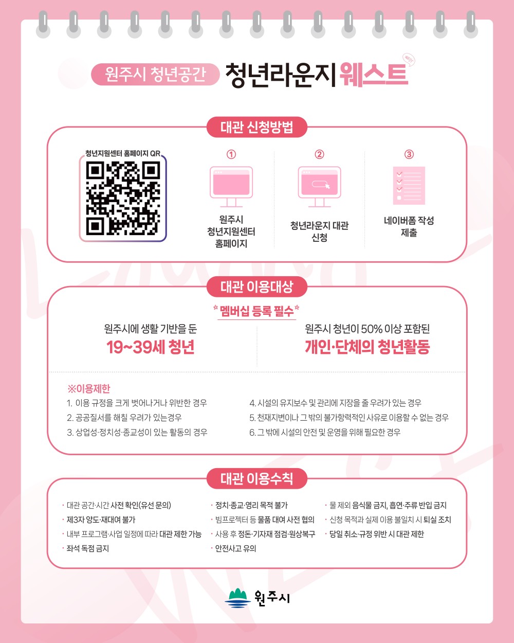 -대관신청: 원주시 청년지원센터 홈페이지 접속 > 프로그램 신청 > 청년라운지 대관신청 > 프로그램 신청하기 > 네이버폼 작성 제출