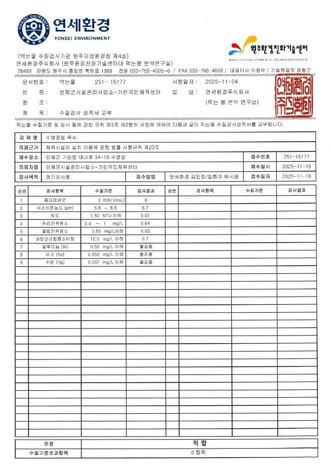 [인제군] 2025년 11월 기린국민체육센터 수영장 수질검사 결과 Home시군별소식61134 안드로메다 안드로메다님의 홈 전체게시물 아이디로 검색 안드로메다님의 홈 전체게시물 아이디로 검색 57분전 144 0 0 LV.1 90% 관련링크 : https://inje.go.kr/portal/adm/notice?articleSeq=243929 5회 연결 신고 목록 게시글 신고 안내 아래 내용중 해당하는 내용이 있을경우 아래 게시글신고 버튼을 클릭하시고 사유를 작성해주시면 빠른시간 안에 삭제및 필요조치하여 드리겠습니다. 로그인후 이용이 가능합니다. 그리고 답변은 메뉴 아이러브강원 > 1:1문의에서 확인이 가능합니다. 자신 또는 제3자를 비방하거나 중상 모략으로 명예를 손상시키는 내용 범죄행위와 관련이 있다고 판단되는 내용 다른 회원 또는 제3자의 저작권 등 기타 권리를 침해하는 내용 타인의 개인정보, 사생활을 침해하거나 명예를 손상시키는 경우 자신의 글을 타인이 도용한 경우 위의 내용 이외에 기타사항 본문 2025년 11월 기린국민체육센터 수영장 수질검사 결과를 붙임과 같이 게시합니다. [출처 : 인제군청 -시정소식-] 0 로그인 후 추천을 하실 수 있습니다. 안드로메다 님의 최신글 안드로메다 님의 최신댓글 시군별소식 - 강원특별자치도 지역개발채권 상환 공고 57분전 시군별소식 - 2025년 11월 기린국민체육센터 수영장 수질검사 결과 57분전 채용정보 - 뷔페 하루 알바 구합니다. 5시간 57분전 채용정보 - 강원특별자치도 사회서비스원(사회복지대체인력지원센터) 기간제 계약직 채용 공고 21시간 57분전 채용정보 - ★★감성커피 인제원통점에서 알바 구인합니다.★★ 2025-11-27 채용정보 - ☆☆☆☆☆☆☆크라운호프 홀서빙 알바 구합니다☆☆☆☆☆☆☆☆☆ 2025-11-27 채용정보 - 2025년 농림어업총조사 조사원 추가 모집(2차) 공고 2025-11-26 채용정보 - 2025년 인제군 다함께돌봄센터 북면점 채용공고 (12월 1일까지 마감) 2025-11-26 뽐&팁 - 멋찌네요.. 2025-08-06 뽐&팁 - 고흐~~~작품이네요 2025-08-06 뽐&팁 - 멋짐니다. 2025-08-06 안드로메다 님의 최신글 안드로메다 님의 최신댓글 시군별소식 - 강원특별자치도 지역개발채권 상환 공고 57분전 시군별소식 - 2025년 11월 기린국민체육센터 수영장 수질검사 결과 57분전 채용정보 - 뷔페 하루 알바 구합니다. 5시간 57분전 채용정보 - 강원특별자치도 사회서비스원(사회복지대체인력지원센터) 기간제 계약직 채용 공고 21시간 57분전 채용정보 - ★★감성커피 인제원통점에서 알바 구인합니다.★★ 2025-11-27 채용정보 - ☆☆☆☆☆☆☆크라운호프 홀서빙 알바 구합니다☆☆☆☆☆☆☆☆☆ 2025-11-27 채용정보 - 2025년 농림어업총조사 조사원 추가 모집(2차) 공고 2025-11-26 채용정보 - 2025년 인제군 다함께돌봄센터 북면점 채용공고 (12월 1일까지 마감) 2025-11-26 뽐&팁 - 멋찌네요.. 2025-08-06 뽐&팁 - 고흐~~~작품이네요 2025-08-06 뽐&팁 - 멋짐니다. 2025-08-06 SNS 댓글목록 0 등록된 댓글이 없습니다.