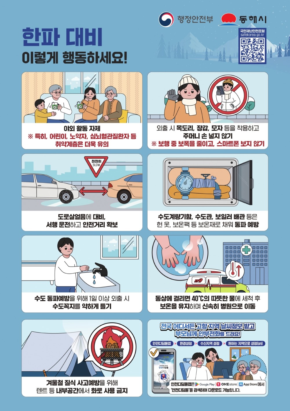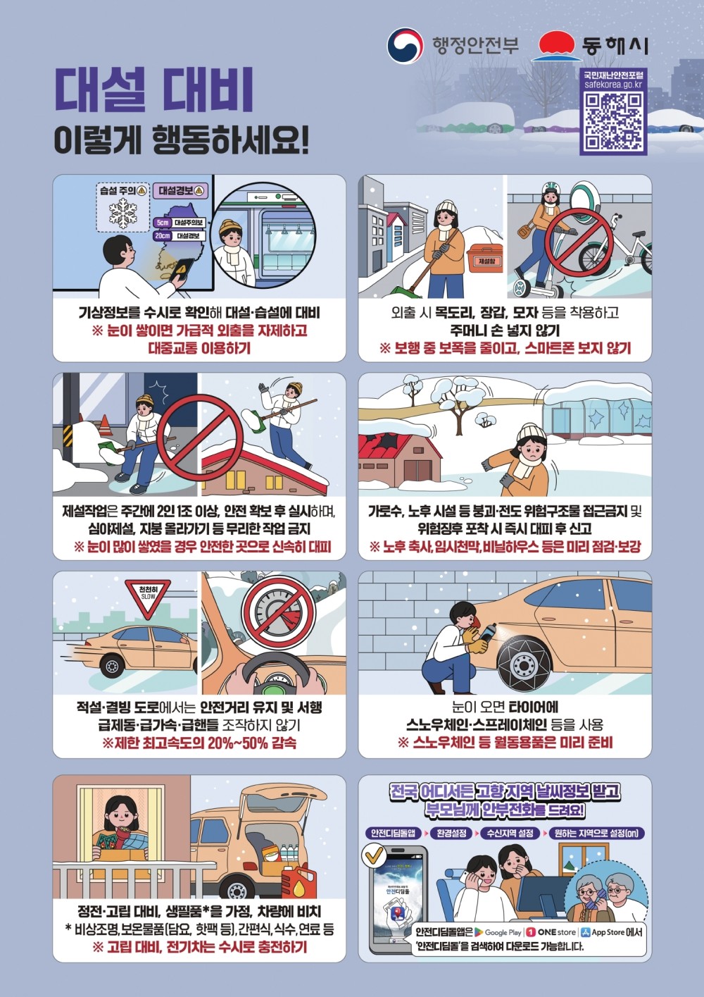 [동해시] 겨울철 자연재난(대설, 한파) 국민행동요령 Home시군별소식61232 윈디 윈디님의 홈 전체게시물 아이디로 검색 윈디님의 홈 전체게시물 아이디로 검색 2025.12.08 20:20 1,092 0 0 LV.1 62% 관련링크 : https://www.dh.go.kr/www/selectBbsNttView.do;JSESSIONID=474EDCA6EB4DD078E92E55FD463ACB9F?key=474&bbsNo=172&nttNo=197432&searchCtgry=&searchCnd=all&searchKrwd=&integrDeptCode=&a… 158회 연결 신고 목록 게시글 신고 안내 아래 내용중 해당하는 내용이 있을경우 아래 게시글신고 버튼을 클릭하시고 사유를 작성해주시면 빠른시간 안에 삭제및 필요조치하여 드리겠습니다. 로그인후 이용이 가능합니다. 그리고 답변은 메뉴 아이러브강원 > 1:1문의에서 확인이 가능합니다. 자신 또는 제3자를 비방하거나 중상 모략으로 명예를 손상시키는 내용 범죄행위와 관련이 있다고 판단되는 내용 다른 회원 또는 제3자의 저작권 등 기타 권리를 침해하는 내용 타인의 개인정보, 사생활을 침해하거나 명예를 손상시키는 경우 자신의 글을 타인이 도용한 경우 위의 내용 이외에 기타사항 본문 이미지 확대보기 이미지 확대보기 겨울철 자연재난(대설, 한파) 국민행동요령 [출처 : 동해시청 -시정소식-] 0 로그인 후 추천을 하실 수 있습니다. 윈디 님의 최신글 윈디 님의 최신댓글 채용정보 - 주간보호 요양보호사 모집 2026-03-04 시군별소식 - 지방소득세(2025년귀속) 연말정산 환급신청 안내 2026-03-04 시군별소식 - 혈당 조절의 첫 걸음, 금연부터 시작해요! 2026-03-04 채용정보 - 매장 직원 모집 2026-03-04 시군별소식 - 수렵면허시험 문제은행 수정본 배포 2026-03-04 시군별소식 - 반려동물 놀이터 개장 안내 2026-03-04 시군별소식 - 2026 꿈꾸는 예술터 기획프로그램 개최 안내 2026-03-03 채용정보 - 2026년 영농부산물 안전처리 지원 기간제 근로자 채용공고 2026-03-03 Q&A - 청주시외버스터미널에서 춘천시외버스터미널에 가는 시외버스의 운행시간표랑 청주시외버스터미널에서 춘천시외버스터미널에 가는 시외버스의 요금입니다청주시외버스터미널에서 춘천시외버스터미널에 가는 시외버스의 운행시간표랑 청주시외버스터미널에서 춘천시외버스터미널에 가는 시외버스의 요금10:05 -> 13:11 소요시간 3시간 06분 요금 일반 21,800원 아동 10,900원 중고생 17,400원15:25 -> 18:31 소요시간 3시간 06분 요금 일반 21,800원 아동 10,900원 중고생 17,400원16:05 -> 19:11… 2026-03-07 Q&A - 조용하고 풍경 진짜 좋아요 ㅎㅎ 편의시설은 약간 부족해서 준비해 가는 게 낫답니다! 주변 맛집은 해산물 위주로 괜찮았어요~ 참고하세요! 2026-02-25 유머 - 부산, 울산, 대구에 눈오면 난리가 납니다. 1년에 눈다운 눈은 한번오면 많이 옵니다. 2026-02-20 유머 - 우와 뒤배도 눈으로? 2026-02-20 Q&A - 아시겠지만 각종 어플로 찾아보시면 질문자님 마음에 드는곳을 찾으실수있을거에요,~ 여기서보다 어플로보면 사진도 볼수있으니깐 더 마음이 놓일것같아요 ~ 좋은여행되시길바랍니다 2026-02-10 뽐&팁 - 좋은팁 감사해용.... 2025-07-07 윈디 님의 최신글 윈디 님의 최신댓글 채용정보 - 주간보호 요양보호사 모집 2026-03-04 시군별소식 - 지방소득세(2025년귀속) 연말정산 환급신청 안내 2026-03-04 시군별소식 - 혈당 조절의 첫 걸음, 금연부터 시작해요! 2026-03-04 채용정보 - 매장 직원 모집 2026-03-04 시군별소식 - 수렵면허시험 문제은행 수정본 배포 2026-03-04 시군별소식 - 반려동물 놀이터 개장 안내 2026-03-04 시군별소식 - 2026 꿈꾸는 예술터 기획프로그램 개최 안내 2026-03-03 채용정보 - 2026년 영농부산물 안전처리 지원 기간제 근로자 채용공고 2026-03-03 Q&A - 청주시외버스터미널에서 춘천시외버스터미널에 가는 시외버스의 운행시간표랑 청주시외버스터미널에서 춘천시외버스터미널에 가는 시외버스의 요금입니다청주시외버스터미널에서 춘천시외버스터미널에 가는 시외버스의 운행시간표랑 청주시외버스터미널에서 춘천시외버스터미널에 가는 시외버스의 요금10:05 -> 13:11 소요시간 3시간 06분 요금 일반 21,800원 아동 10,900원 중고생 17,400원15:25 -> 18:31 소요시간 3시간 06분 요금 일반 21,800원 아동 10,900원 중고생 17,400원16:05 -> 19:11… 2026-03-07 Q&A - 조용하고 풍경 진짜 좋아요 ㅎㅎ 편의시설은 약간 부족해서 준비해 가는 게 낫답니다! 주변 맛집은 해산물 위주로 괜찮았어요~ 참고하세요! 2026-02-25 유머 - 부산, 울산, 대구에 눈오면 난리가 납니다. 1년에 눈다운 눈은 한번오면 많이 옵니다. 2026-02-20 유머 - 우와 뒤배도 눈으로? 2026-02-20 Q&A - 아시겠지만 각종 어플로 찾아보시면 질문자님 마음에 드는곳을 찾으실수있을거에요,~ 여기서보다 어플로보면 사진도 볼수있으니깐 더 마음이 놓일것같아요 ~ 좋은여행되시길바랍니다 2026-02-10 뽐&팁 - 좋은팁 감사해용.... 2025-07-07 SNS 댓글목록 0 등록된 댓글이 없습니다.