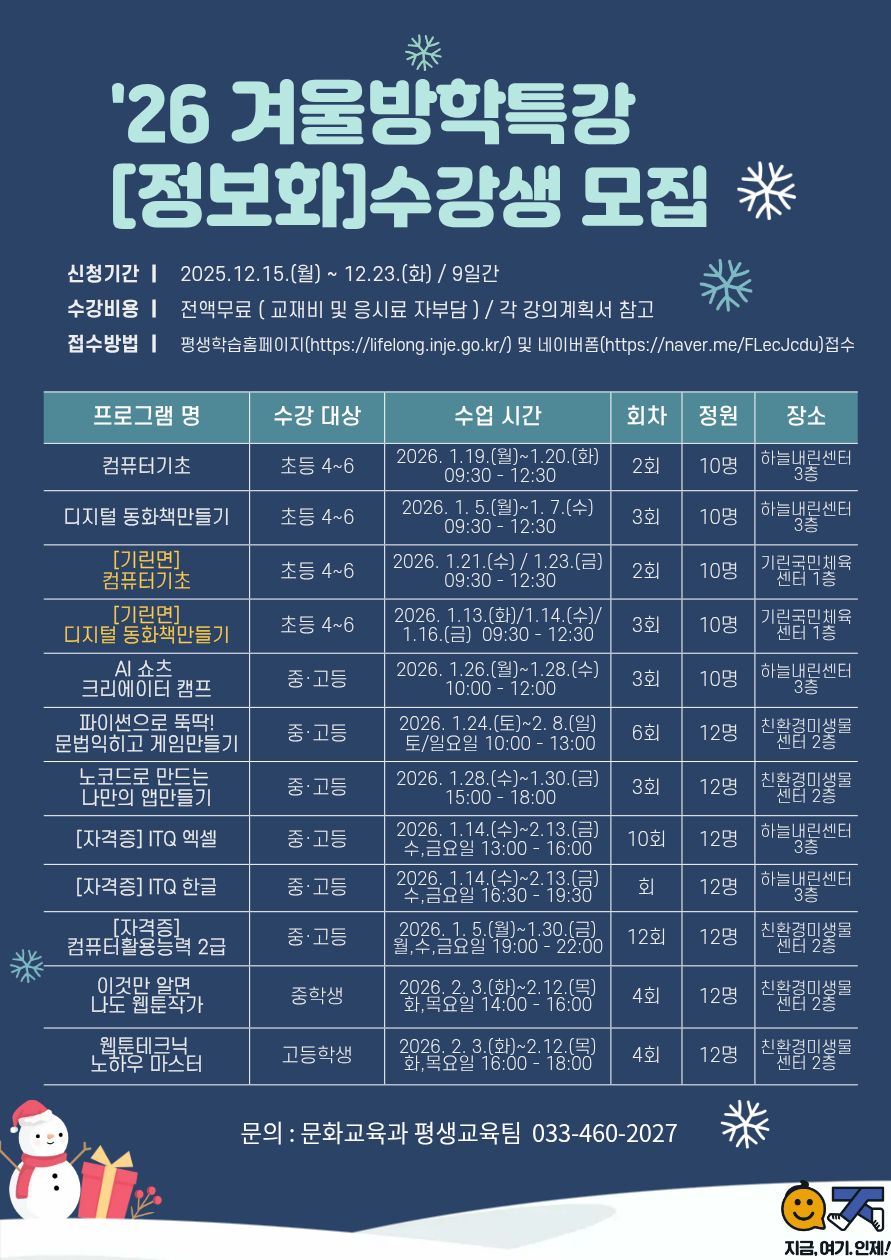 [인제군] [겨울방학특강]2026년 인제군 정보화교육[청소년] 수강생 모집