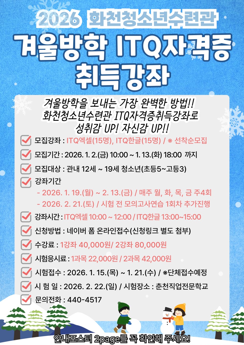 [화천군] 2026 화천청소년수련관 겨울방학 ITQ자격증 취득강좌(엑셀, 한글) 수강생 모집