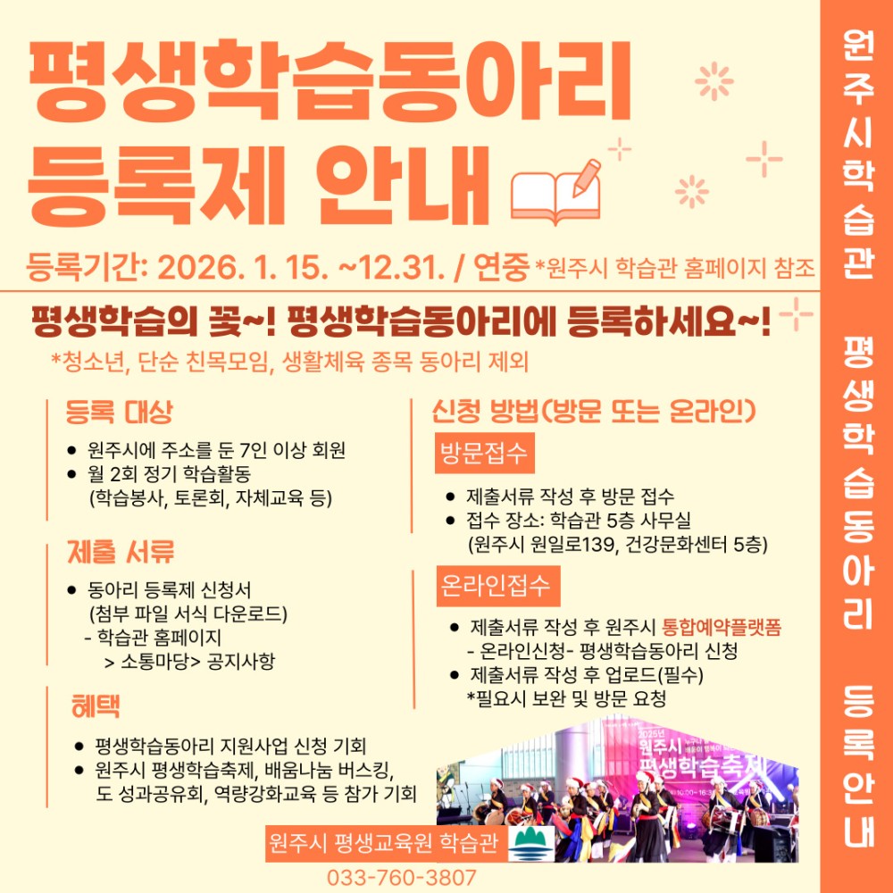 원주시 평생교육원 학습관에서 2026년 '평생학습 동아리 등록제'를 운영하오니 관심있는 분들의 많은 신청바랍니다.