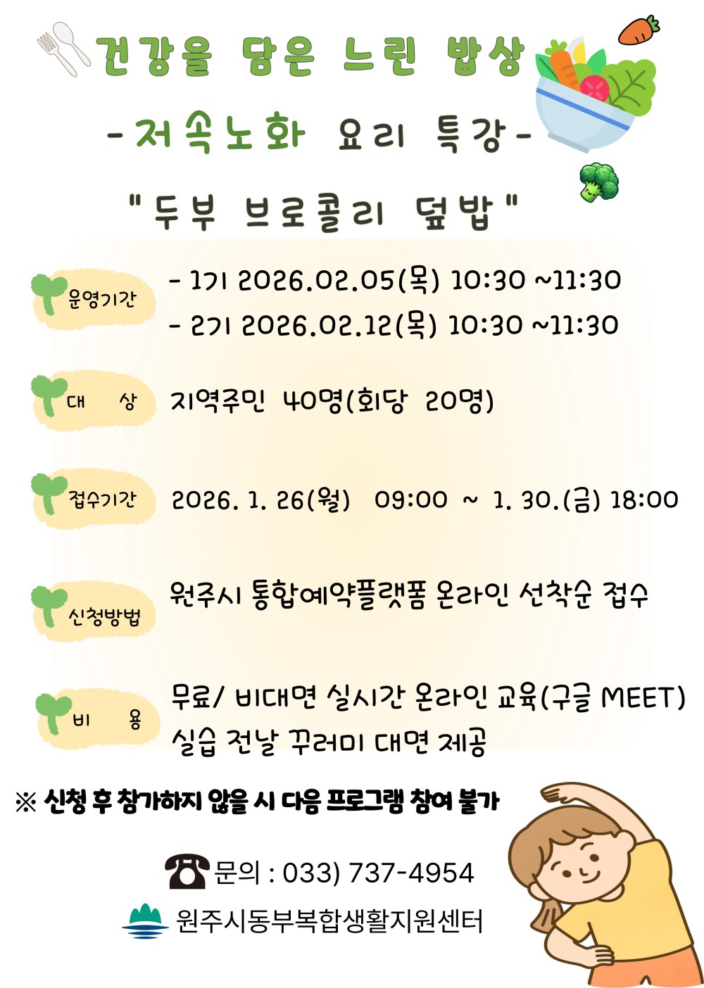 [원주시] 동부복합생활지원센터 건강관 저속노화 요리 특강 「건강을 담은 느린 밥상」 참여자 모집