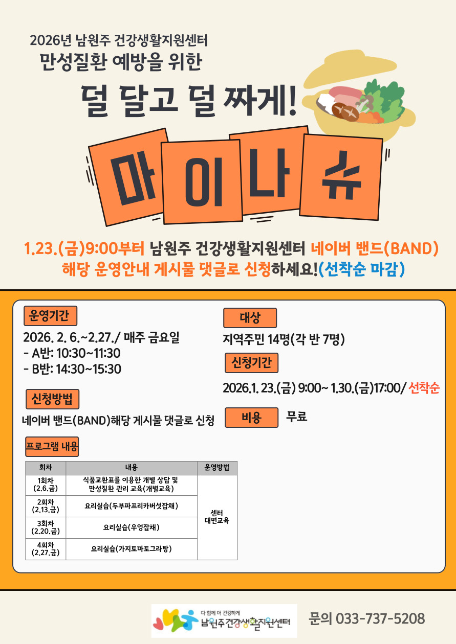[원주시] 남원주 건강생활지원센터 만성질환예방을 위한 「덜 달고 덜 짜게! 마이나슈 요리교실」 참여자 모집안내