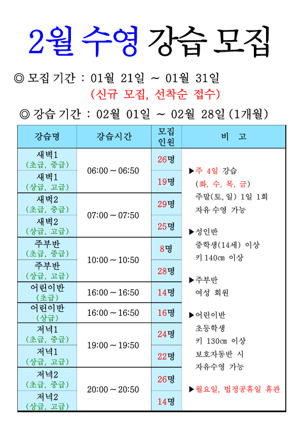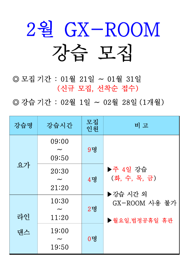 [인제군] 원통체육문화센터 2월 운영달력 및 (수영,라인댄스,요가 )강습 모집 안내