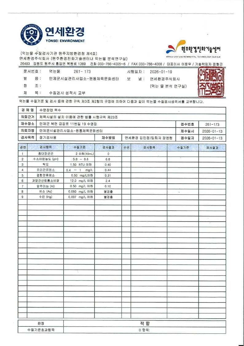 [인제군] 2026년 1월 원통체육문화센터 수영장 수질 검사 결과안내 Home시군별소식61746 소셜우주 소셜우주님의 홈 전체게시물 아이디로 검색 소셜우주님의 홈 전체게시물 아이디로 검색 2026.01.22 16:20 580 0 0 LV.1 69% 관련링크 : https://inje.go.kr/portal/adm/notice?articleSeq=245987 85회 연결 신고 목록 게시글 신고 안내 아래 내용중 해당하는 내용이 있을경우 아래 게시글신고 버튼을 클릭하시고 사유를 작성해주시면 빠른시간 안에 삭제및 필요조치하여 드리겠습니다. 로그인후 이용이 가능합니다. 그리고 답변은 메뉴 아이러브강원 > 1:1문의에서 확인이 가능합니다. 자신 또는 제3자를 비방하거나 중상 모략으로 명예를 손상시키는 내용 범죄행위와 관련이 있다고 판단되는 내용 다른 회원 또는 제3자의 저작권 등 기타 권리를 침해하는 내용 타인의 개인정보, 사생활을 침해하거나 명예를 손상시키는 경우 자신의 글을 타인이 도용한 경우 위의 내용 이외에 기타사항 본문 2026년 1월 원통체육문화센터 실내수영장 수질검사 성적서 입니다. 이용에 참고하시길 바랍니다 [출처 : 인제군청 -시정소식-] 0 로그인 후 추천을 하실 수 있습니다. 소셜우주 님의 최신글 소셜우주 님의 최신댓글 채용정보 - 봉면 아틀리에 단기 시간 근무원하시는 분 (주 5일, 점심만) 54분전 채용정보 - 2026년 인제교육지원청 소속 기간제 교육공무직(조리실무사) 채용 13시간 54분전 채용정보 - 빛나라 어린이집 연장교사 채용 13시간 54분전 채용정보 - 트리헌드레드 카페에서 함께 일할 직원을 찾습니다. 13시간 54분전 시군별소식 - 26년 봄철 꿀벌응애 방역수칙을 안내 21시간 54분전 채용정보 - 믹서트럭(지입)모집-상인산업(주) 21시간 54분전 채용정보 - ☎☎☎☎빽다방 원통점 주말미들 근무자님 구합니다☎☎☎☎ 21시간 54분전 채용정보 - @@@@@가 인 상 사 직 원 모 집@@@@@ 2026-03-09 최신글이 없습니다. 소셜우주 님의 최신글 소셜우주 님의 최신댓글 채용정보 - 봉면 아틀리에 단기 시간 근무원하시는 분 (주 5일, 점심만) 54분전 채용정보 - 2026년 인제교육지원청 소속 기간제 교육공무직(조리실무사) 채용 13시간 54분전 채용정보 - 빛나라 어린이집 연장교사 채용 13시간 54분전 채용정보 - 트리헌드레드 카페에서 함께 일할 직원을 찾습니다. 13시간 54분전 시군별소식 - 26년 봄철 꿀벌응애 방역수칙을 안내 21시간 54분전 채용정보 - 믹서트럭(지입)모집-상인산업(주) 21시간 54분전 채용정보 - ☎☎☎☎빽다방 원통점 주말미들 근무자님 구합니다☎☎☎☎ 21시간 54분전 채용정보 - @@@@@가 인 상 사 직 원 모 집@@@@@ 2026-03-09 최신글이 없습니다. SNS 댓글목록 0 등록된 댓글이 없습니다.