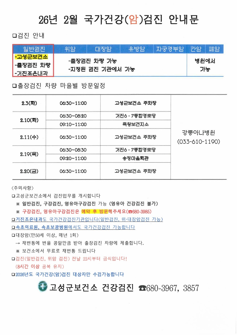 [고성군] 2026년 2월 국가건강(암) 출장검진차량 일정 안내 …