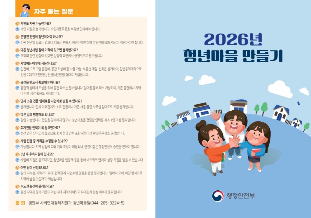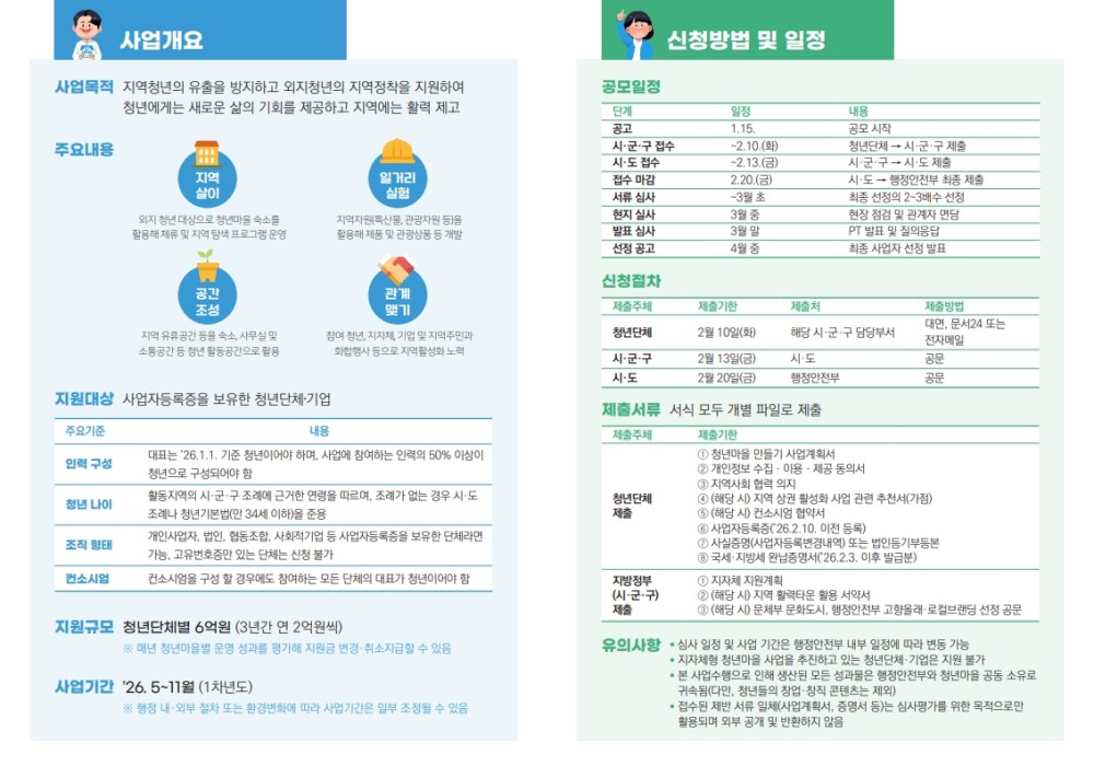 [평창군] 「2026년 청년마을 만들기 사업」 공모 안내 Home시군별소식61790 텔레비전 텔레비전님의 홈 전체게시물 아이디로 검색 텔레비전님의 홈 전체게시물 아이디로 검색 2026.01.27 12:20 559 0 0 LV.1 79% 첨부파일 : () 다운로드 첨부파일 : () 다운로드 관련링크 : https://pc.go.kr/portal/government/government-news/government-news-agency?articleSeq=323648 78회 연결 신고 목록 게시글 신고 안내 아래 내용중 해당하는 내용이 있을경우 아래 게시글신고 버튼을 클릭하시고 사유를 작성해주시면 빠른시간 안에 삭제및 필요조치하여 드리겠습니다. 로그인후 이용이 가능합니다. 그리고 답변은 메뉴 아이러브강원 > 1:1문의에서 확인이 가능합니다. 자신 또는 제3자를 비방하거나 중상 모략으로 명예를 손상시키는 내용 범죄행위와 관련이 있다고 판단되는 내용 다른 회원 또는 제3자의 저작권 등 기타 권리를 침해하는 내용 타인의 개인정보, 사생활을 침해하거나 명예를 손상시키는 경우 자신의 글을 타인이 도용한 경우 위의 내용 이외에 기타사항 본문 「2026년 청년마을 만들기 사업」 공모 안내 [출처 : 평창군청 -시정소식-] 0 로그인 후 추천을 하실 수 있습니다. 텔레비전 님의 최신글 텔레비전 님의 최신댓글 시군별소식 - 평창군 일반임기제공무원(평생교육사) 임용시험 시행계획 재공고 24시간 46분전 채용정보 - 안정정육식당 주방 보조직원 구함 2026-03-08 시군별소식 - ’26년 물 공급 취약지역 안심지하수 지원사업 2026-03-07 채용정보 - 기간제근로자 구인공고(나이무관) 2026-03-05 채용정보 - 영아연장반 담임교사채용 2026-03-04 채용정보 - 2026년 "평창문에대학" 수강생 모집 공고 2026-03-03 유머 - 아내한테 플스 산거 걸려도 환불 안 해도 되는 경우 2026-03-02 채용정보 - 평창군 도시재생지원센터 직원 채용공고 알림 2026-03-02 유머 - ㅎㅎㅎ 그림이랑 똑 같아요 2026-02-20 텔레비전 님의 최신글 텔레비전 님의 최신댓글 시군별소식 - 평창군 일반임기제공무원(평생교육사) 임용시험 시행계획 재공고 24시간 46분전 채용정보 - 안정정육식당 주방 보조직원 구함 2026-03-08 시군별소식 - ’26년 물 공급 취약지역 안심지하수 지원사업 2026-03-07 채용정보 - 기간제근로자 구인공고(나이무관) 2026-03-05 채용정보 - 영아연장반 담임교사채용 2026-03-04 채용정보 - 2026년 "평창문에대학" 수강생 모집 공고 2026-03-03 유머 - 아내한테 플스 산거 걸려도 환불 안 해도 되는 경우 2026-03-02 채용정보 - 평창군 도시재생지원센터 직원 채용공고 알림 2026-03-02 유머 - ㅎㅎㅎ 그림이랑 똑 같아요 2026-02-20 SNS 댓글목록 0 등록된 댓글이 없습니다.