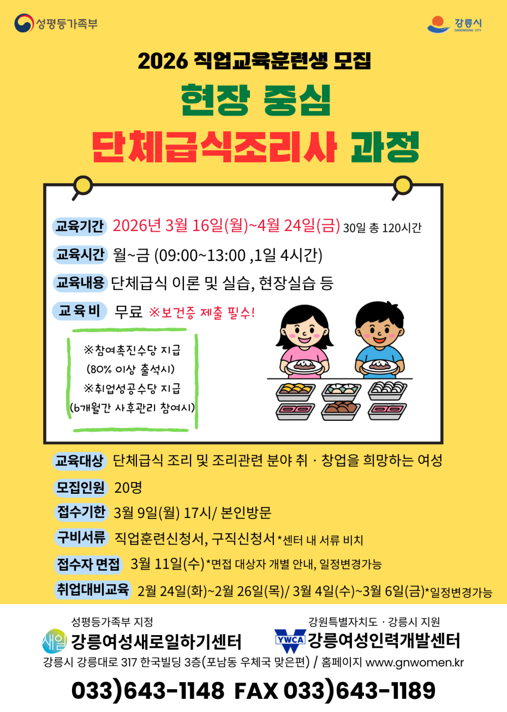 강릉여성새로일하기센터에서는 성평등가족부 여성 취업지원 사업의 일환으로 '현장 중심 단체급식조리사' 직업교육 훈련을 진행합니다. 관심 있는 분들의 많은 참여 바랍니다.