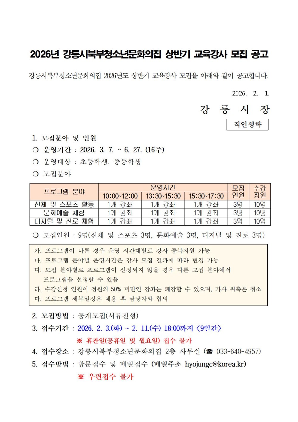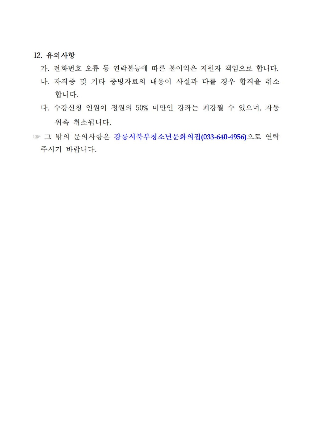 [강릉시] 2026년 강릉시북부청소년문화의집 상반기 교육강사 모집 Home시군별소식61908 한뵤리 한뵤리님의 홈 전체게시물 아이디로 검색 한뵤리님의 홈 전체게시물 아이디로 검색 2026.02.03 12:20 571 0 0 LV.2 37% 첨부파일 : () 다운로드 첨부파일 : () 다운로드 관련링크 : http://www.gn.go.kr/www/selectBbsNttView.do?key=258&bbsNo=12&nttNo=202895&searchCtgry=&searchCnd=all&searchKrwd=&pageIndex=1&integrDeptCode= 76회 연결 신고 목록 게시글 신고 안내 아래 내용중 해당하는 내용이 있을경우 아래 게시글신고 버튼을 클릭하시고 사유를 작성해주시면 빠른시간 안에 삭제및 필요조치하여 드리겠습니다. 로그인후 이용이 가능합니다. 그리고 답변은 메뉴 아이러브강원 > 1:1문의에서 확인이 가능합니다. 자신 또는 제3자를 비방하거나 중상 모략으로 명예를 손상시키는 내용 범죄행위와 관련이 있다고 판단되는 내용 다른 회원 또는 제3자의 저작권 등 기타 권리를 침해하는 내용 타인의 개인정보, 사생활을 침해하거나 명예를 손상시키는 경우 자신의 글을 타인이 도용한 경우 위의 내용 이외에 기타사항 본문 2026년 강릉시북부청소년문화의집 상반기 교육강사 모집 사진 확대보기 사진 확대보기 사진 확대보기 [출처 : 강릉시청 -시정소식-] 0 로그인 후 추천을 하실 수 있습니다. 한뵤리 님의 최신글 한뵤리 님의 최신댓글 시군별소식 - 강릉역-양양공항 무료 광역순환버스 운행시간 변경 안내('26.3.29~10.24.) 11시간 37분전 채용정보 - 평창군 도시재생지원센터 직원채용(접수기간 3.6.(금)~3.10.(화)까지) 11시간 37분전 채용정보 - 강릉지역자활센터 장애인활동지원사 모집(접수기간 3.6.(금)~채용시까지) 11시간 37분전 뽐&팁 - 보이스피싱 대처법 2026-03-08 채용정보 - 평창군 도시재생지원센터 직원채용(접수기간:3.6.(금)~3.10.(화)까지) 2026-03-07 채용정보 - Stay 송정 기간제근로자 채용 공고 모집(접수기간: 3.6(금)~3.9(월) 18시까지) 2026-03-07 시군별소식 - 2026년 소상공인 IP출원(상표출원) 지원사업 수혜자 모집 안내 2026-03-05 채용정보 - 한전KPS 강릉사업소 제26-3차 단기노무원 채용공고 (청소 및 세탁) (접수기간 : 03.05(목) ~ 03.13 (금) 11:00 까지) 2026-03-05 Q&A - 바다보며회먹기딱좋답니다 스끼다시도푸짐하고서비스도괜찮았어요 가족들이랑가기괜찮으니 한번가보세요ㅎㅎ 2026-02-20 유머 - 그 다음 얘기가 궁금해서 오늘 밤 잠이 안 올거 같습니다 2026-02-20 유머 - ㅋㅋㅋㅋㅋ 2026-02-20 Q&A - 신분증 필요없고 주민번호 앞자리 아니면 고객센터 전화하셔서 납부도 가능합니다.카드도 됩니다 2026-02-09 Q&A - 비용이 좀 나와서 그렀지 전국 어디라도 갑니다서울도 물론 가구요. 2026-02-07 나눔장터 - 판매완료입니다. 2025-09-19 잡담 - 참담한 현실이네요..ㅠㅠ 2025-08-22 잡담 - 요즘은 편의점이 백화점이네요 2025-08-20 한뵤리 님의 최신글 한뵤리 님의 최신댓글 시군별소식 - 강릉역-양양공항 무료 광역순환버스 운행시간 변경 안내('26.3.29~10.24.) 11시간 37분전 채용정보 - 평창군 도시재생지원센터 직원채용(접수기간 3.6.(금)~3.10.(화)까지) 11시간 37분전 채용정보 - 강릉지역자활센터 장애인활동지원사 모집(접수기간 3.6.(금)~채용시까지) 11시간 37분전 뽐&팁 - 보이스피싱 대처법 2026-03-08 채용정보 - 평창군 도시재생지원센터 직원채용(접수기간:3.6.(금)~3.10.(화)까지) 2026-03-07 채용정보 - Stay 송정 기간제근로자 채용 공고 모집(접수기간: 3.6(금)~3.9(월) 18시까지) 2026-03-07 시군별소식 - 2026년 소상공인 IP출원(상표출원) 지원사업 수혜자 모집 안내 2026-03-05 채용정보 - 한전KPS 강릉사업소 제26-3차 단기노무원 채용공고 (청소 및 세탁) (접수기간 : 03.05(목) ~ 03.13 (금) 11:00 까지) 2026-03-05 Q&A - 바다보며회먹기딱좋답니다 스끼다시도푸짐하고서비스도괜찮았어요 가족들이랑가기괜찮으니 한번가보세요ㅎㅎ 2026-02-20 유머 - 그 다음 얘기가 궁금해서 오늘 밤 잠이 안 올거 같습니다 2026-02-20 유머 - ㅋㅋㅋㅋㅋ 2026-02-20 Q&A - 신분증 필요없고 주민번호 앞자리 아니면 고객센터 전화하셔서 납부도 가능합니다.카드도 됩니다 2026-02-09 Q&A - 비용이 좀 나와서 그렀지 전국 어디라도 갑니다서울도 물론 가구요. 2026-02-07 나눔장터 - 판매완료입니다. 2025-09-19 잡담 - 참담한 현실이네요..ㅠㅠ 2025-08-22 잡담 - 요즘은 편의점이 백화점이네요 2025-08-20 SNS 댓글목록 0 등록된 댓글이 없습니다.