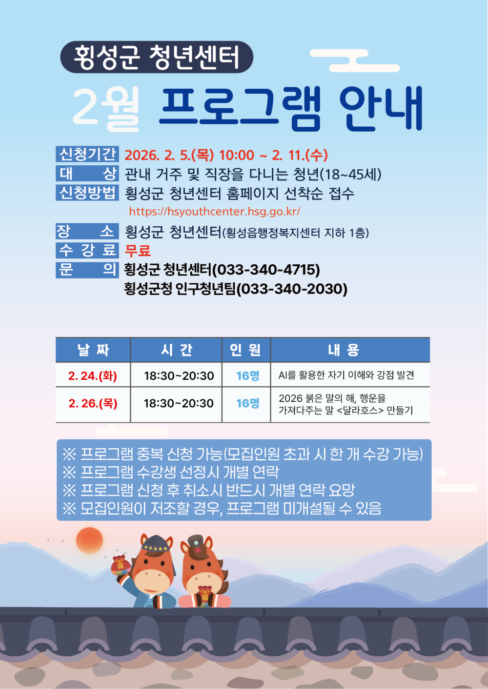 [횡성군] [대표]  횡성군 청년센터 2월 프로그램 수강생 모집 안내