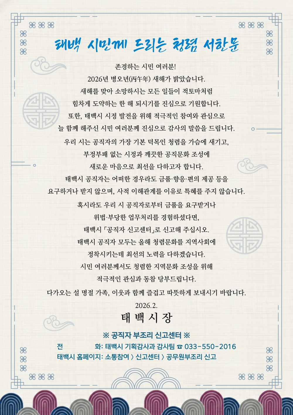 태백시 공직자 모두는 올해 청렴문화를 지역사회에 정착시키는데 최선의 노력을 다하겠습니다. 시민 여러분께서도 청렴한 지역문화 조성을 위해 적극적인 관심과 동참 당부드립니다.
