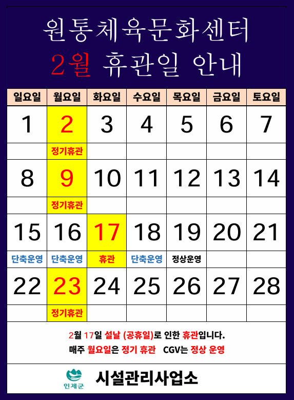■ 2026년 2월 원통체육문화센터 설연휴 운영시간을 안내해 드리오니 시설이용에 참고하시기 바랍니다.