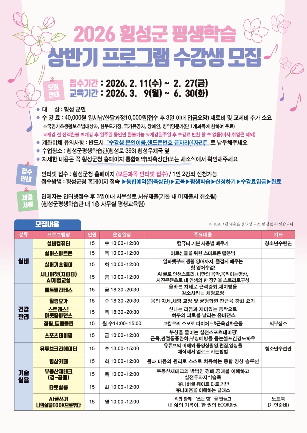 [횡성군] [대표]  2026년 평생학습관 상반기 프로그램 수강생 모집 안내