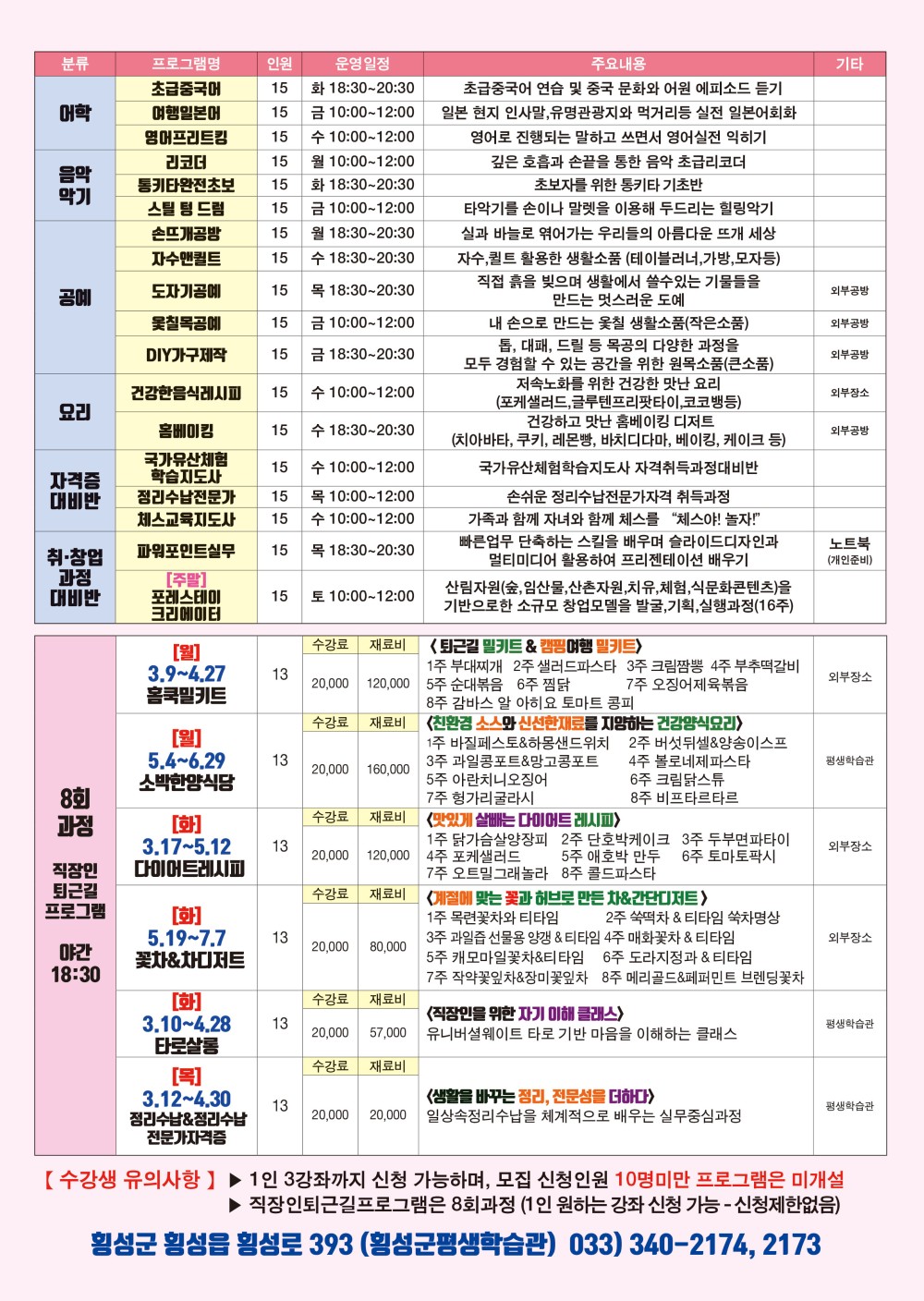 ★ 홈페이지 접수방법– 횡성군청 - 좌측상단 통합예약 - 교육 - 평생학습 - 신청하기 - 수강료 입금 - 완료