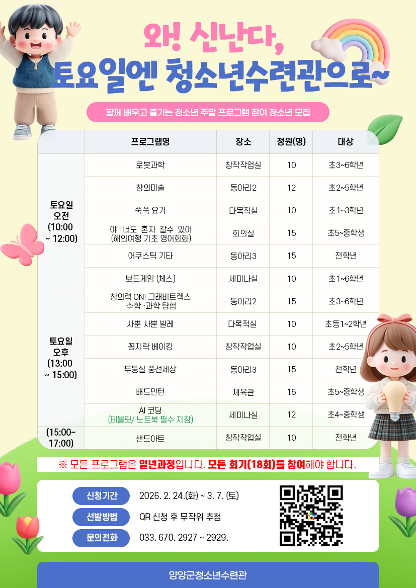 [양양군] 2026년 양양군청소년수련관 주말 프로그램 참여 청소년 모집