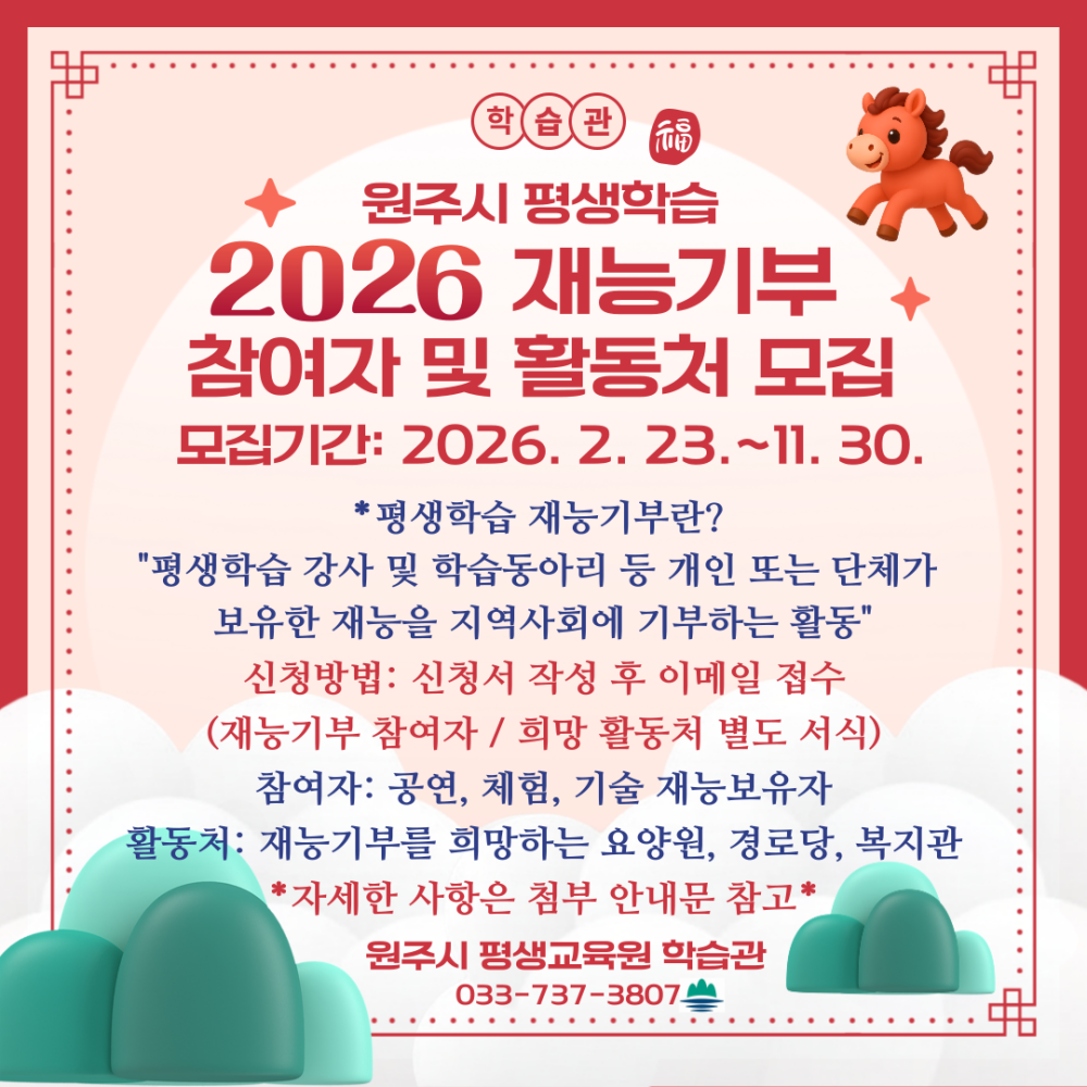 원주시 평생교육원 학습관에서 2026년 평생학습 재능기부 참여자 및 활동처를 모집하오니 관심있는 동아리 및 기관, 단체(경로당, 요양원, 복지관 등)의 많은 신청바랍니다.
